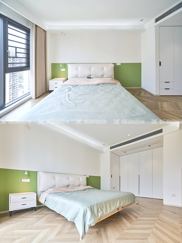 床位位置做了半墻設計,既可以遮擋臥室衛生間門,又可以作為梳妝臺背景