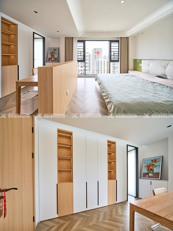 今天這個臥室做了充足收納的步入式衣帽間+半墻隔斷梳妝臺+書柜展示