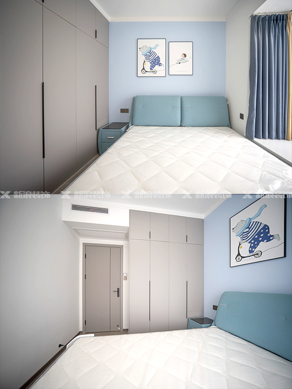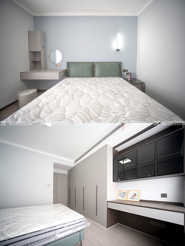 全屋定制:柜體板材是十環認證萬象天冠18厚杉木實芯板,柜門做的是歐松板模壓門;五金是奧地利進口百隆五金,自有全屋定制工廠實現門、墻、柜體化;