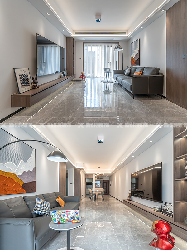 客餐廳吊頂一體,用線性燈延伸點綴,看起來真的很顯大!