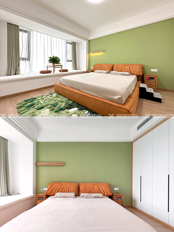臥室床頭墻面為綠色乳膠漆,搭配青苔地毯,仿佛是把春天裝進了家里!