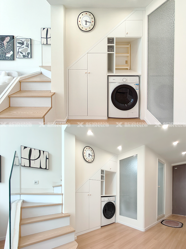 樓梯間空間充分利用放洗衣機以及定制收納柜,嚴絲合縫不留衛生死角。