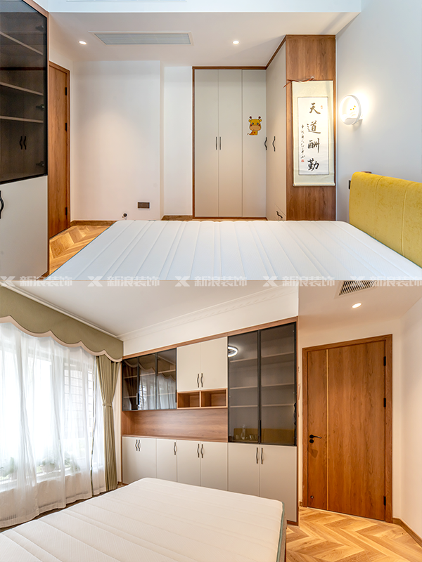 高端全屋定制:柜體板材為十環認證的萬象天冠18mm厚杉木芯板、柜門是歐松板雙飾面門、奧地利進口百隆五金。