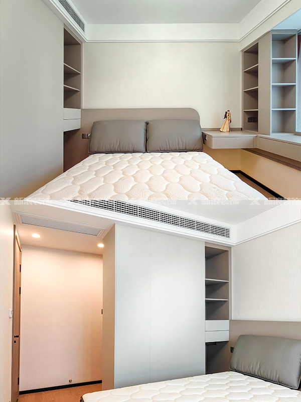主臥室床頭位置做內嵌床頭柜,梳妝臺+轉角飄窗+書桌,增加儲物空間與臺面空間。