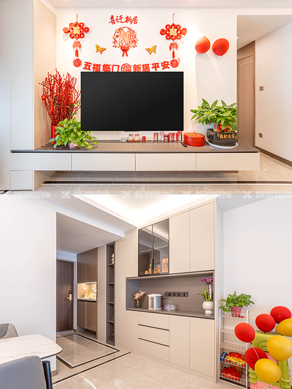 客廳利用穿插設計做了簡單的電視背景柜。整個公共區域全部做了免拉手設計,利用免拉手的線條分割柜門。簡單又不失細節,非常顯高級。