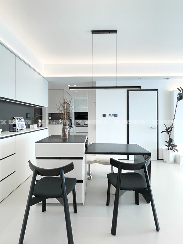 白色地毯、單人椅和黑色沙發(fā)、餐桌椅、島臺(tái)相輔相成。