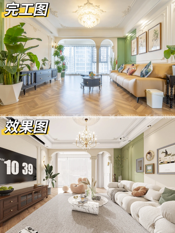 這套橄欖綠復(fù)古法式風(fēng)格的房子就是我們“整裝模式”落地還原的案例之一。