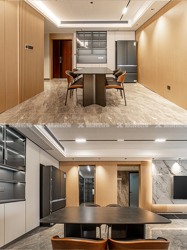 全屋地面采用600*1200大理石紋灰色瓷磚通鋪,加同色美縫