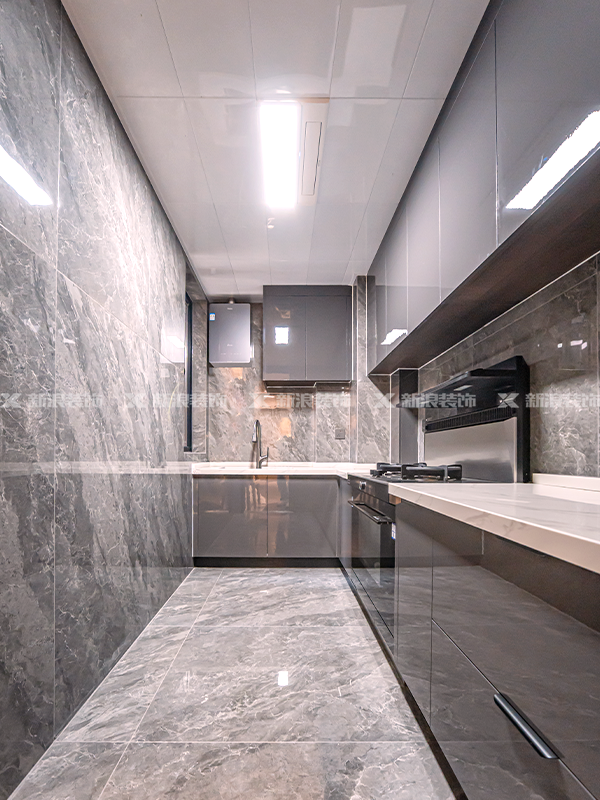 廚房做深灰高端實木定制櫥柜,亮面櫥柜門簡約好打理衛生。