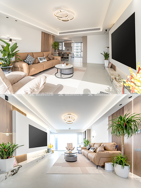 沙發背景墻和電視背景做同色護墻板撞色設計,搭配線形燈點綴,很出效果~