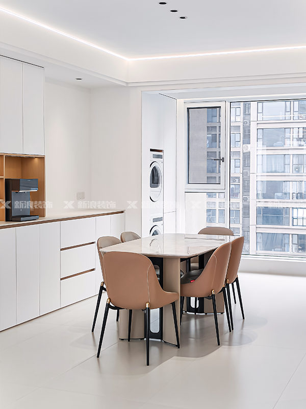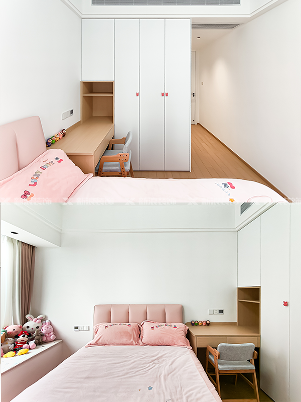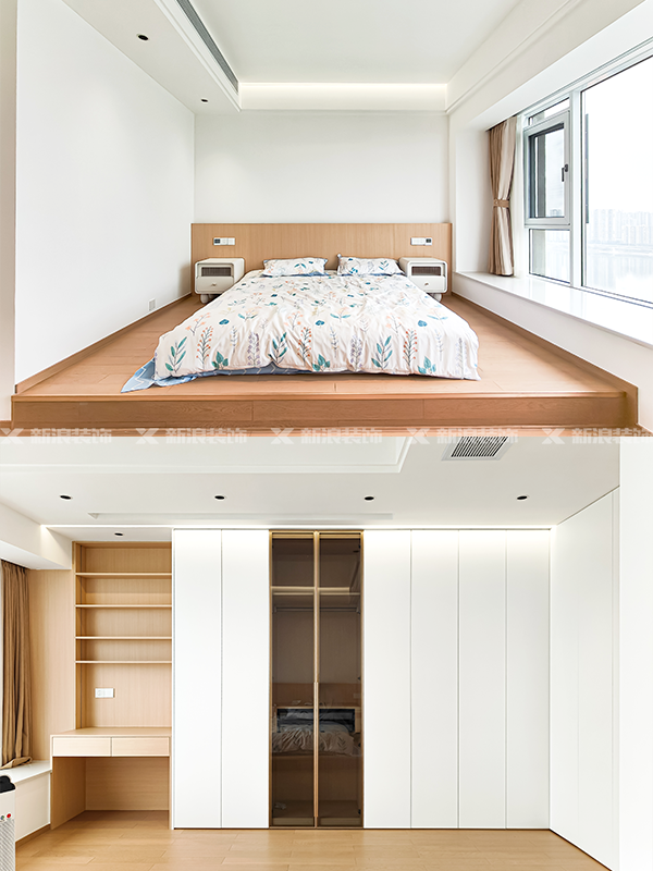 全房定制采用白色和原木色搭配,有藏有露,搭配氛圍燈帶,高級盡顯~