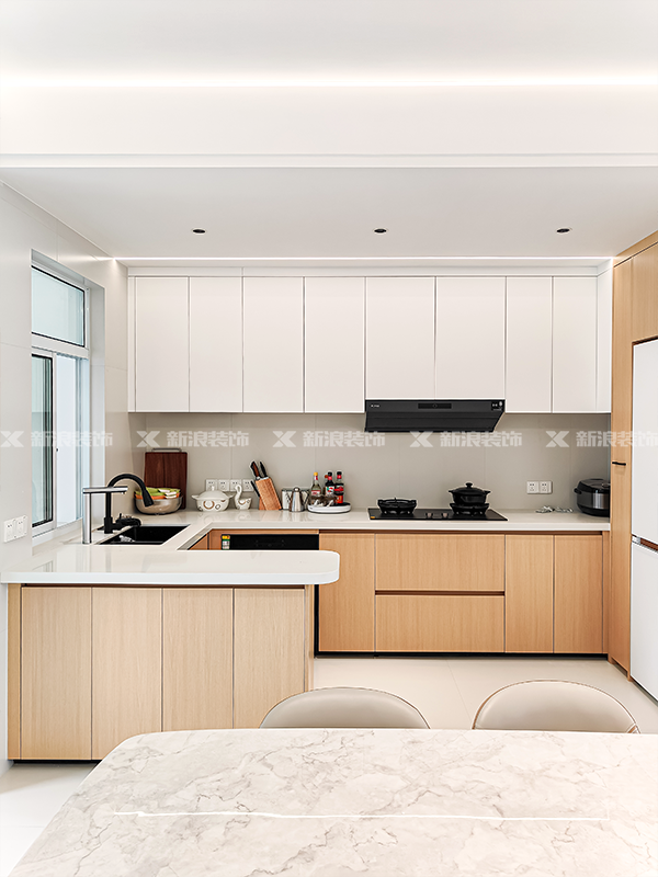 半開放廚房,空間通透。側(cè)面延伸做小吧臺,增加操作空間。