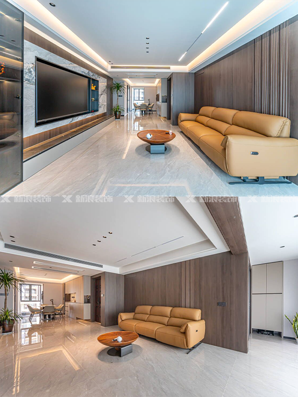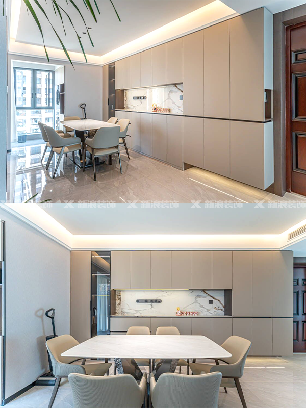 整體色調統一,用木飾面、巖板、大理石等不同材質碰撞,整體空間精致感十足