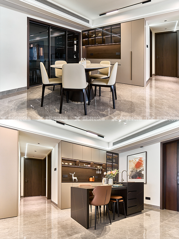 公共區域分為4大部分,茶室、觀影、西廚餐島臺、中式圓桌餐廚區,一家人的互動、休閑都滿足。