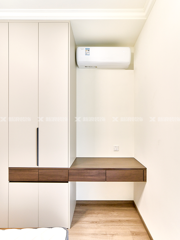 靠窗邊穿插設計一字長條懸浮梳妝臺,上方給空調留出空間,保持呼吸感