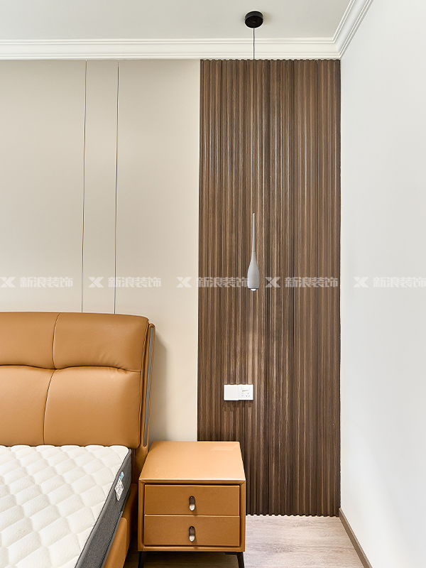 同色煙熏深棕格柵和淺灰簡約床頭背景,好打理又富有設計感