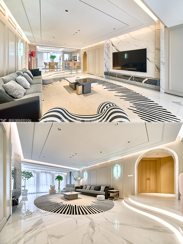 整體以簡約黑白為主,弧形吊頂延伸至陽臺將打通的空間融合進室內,打破方盒子的平衡,創造了更具魅力的空間。