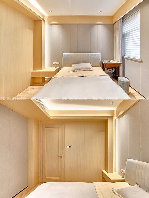 臥室軟包、木皮等材質上墻,呈現出豐富的層次感,將藝術與功能轉化為精致的細節,營造出靜謐舒適的休憩氛圍。陽光透過建筑灑入室內,帶來溫柔與浪漫之感。