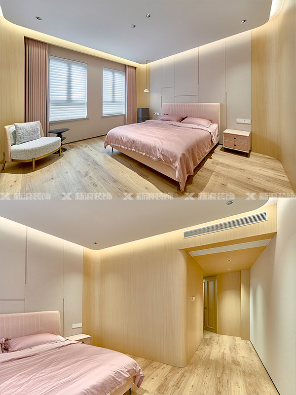 臥室軟裝木皮等材質上墻,呈現(xiàn)出豐富的層次感。