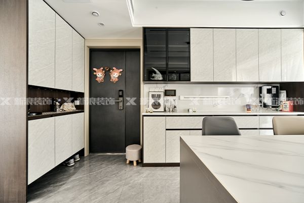 入戶連接餐廳,兩側分別做鞋柜和餐邊柜,中空留作吧臺,置物飲水方便實用。