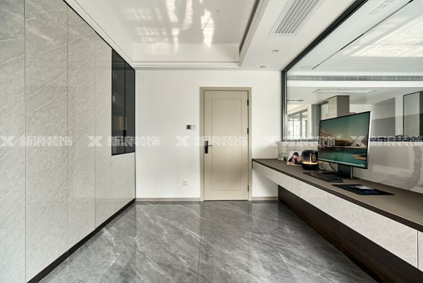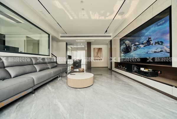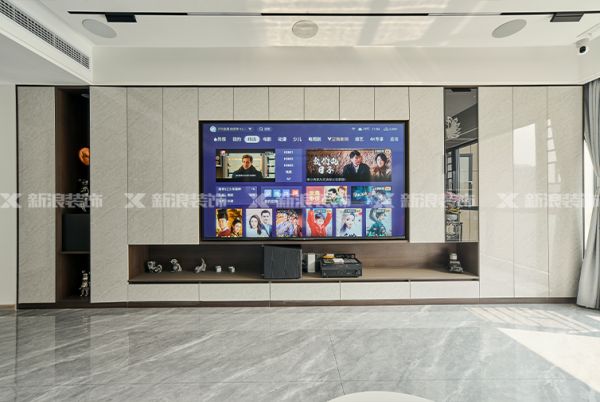 客廳瓷磚通鋪,嵌入式電視柜+超晶飾面,無主燈設計呈現都市時尚風格。