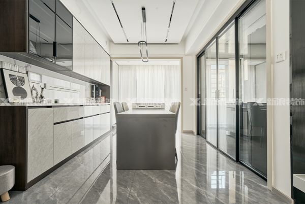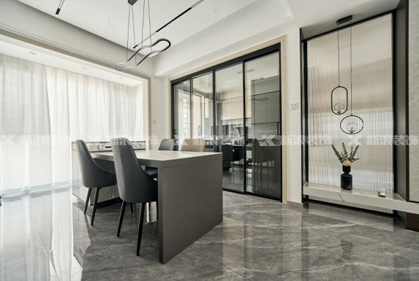 餐廳島臺+巖板餐桌,玻璃門隔斷廚房,搭配造型燈和插花裝飾,呈現出藝術與高級感。