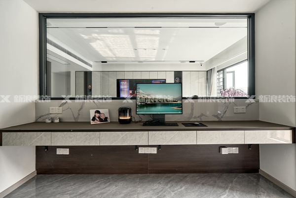 書房采用玻璃窗半隔斷客廳,窗戶一側做滿書桌,既大氣明亮又寬敞實用。