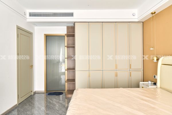 臥室選用溫暖的橘色調,米色衣柜搭配金屬裝飾條,整個空間溫馨精致。