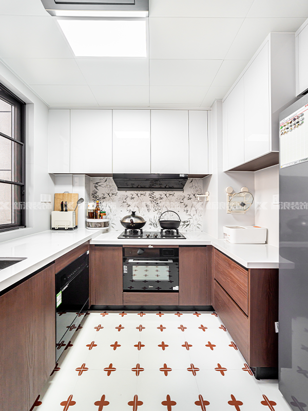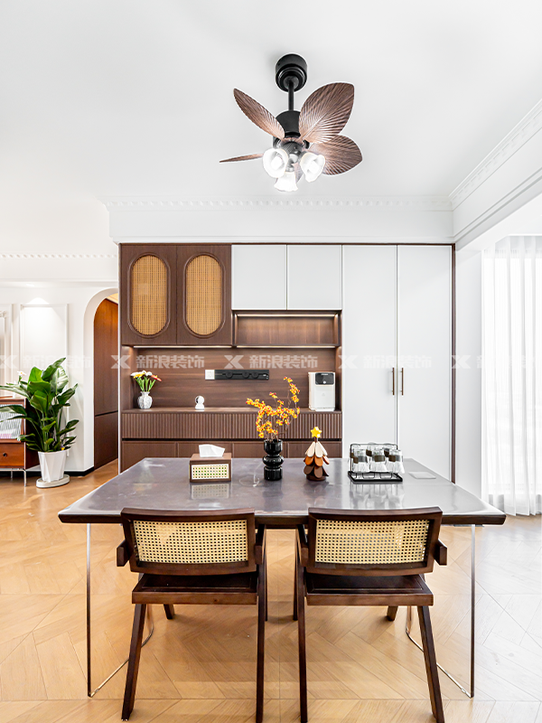 ?? 書房、廚衛善用黑框造型玻璃推拉門,定制柜做胡桃木色,部分空間做藤編柜門,高端定制同色同造型真的超美!