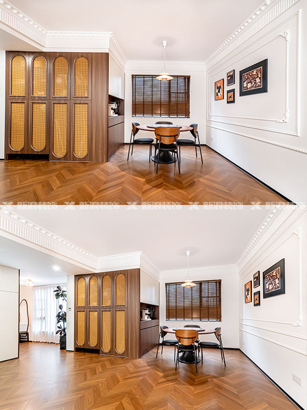 全房通鋪魚骨紋復(fù)古瓷磚,搭配同色系木色高端定制柜體,質(zhì)感直接拉滿!藤編柜門和法式角花裝飾線條,細節(jié)控表示太愛了!每一處都經(jīng)得起推敲,審美在線!