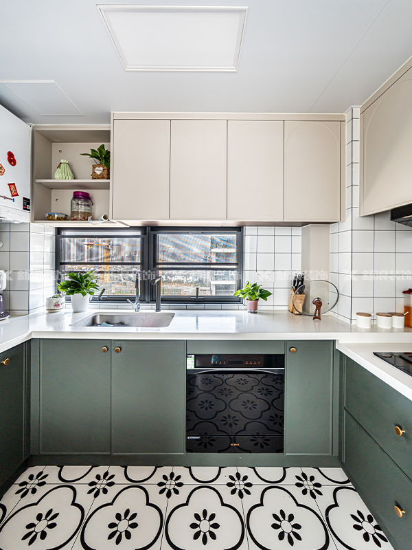 地面復古木紋磚通鋪,暖色調的木紋磚和胡桃木色、榆木色定制柜相得益彰,自然又溫馨。走起來腳感舒適,而且特別容易清潔打理,實用性拉滿