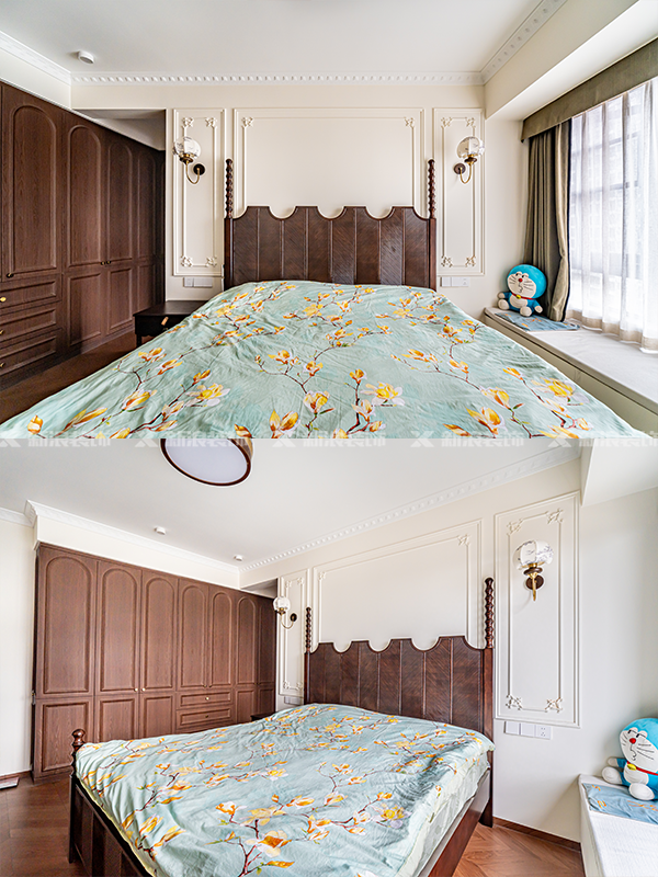 在吊頂和部分背景墻采用了法式石膏線條進行裝飾。精致的雕花線條,加上一些小巧的浮雕點綴,讓整個墻面充滿了立體感和藝術氣息,這細節,誰能不愛呢