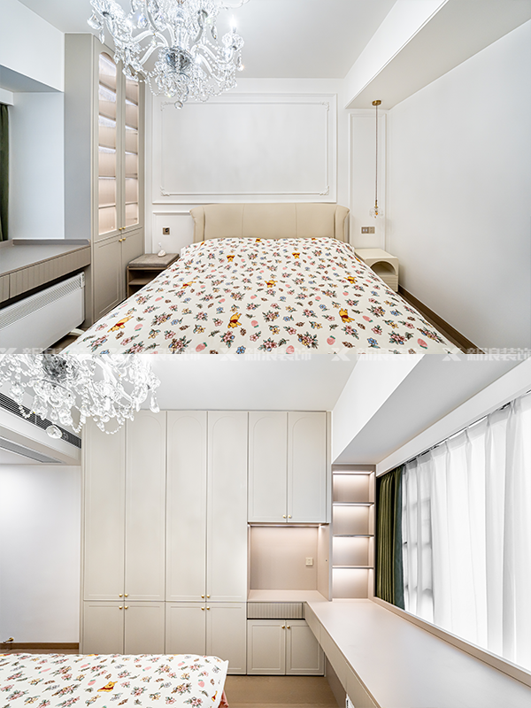主臥利用床尾加飄窗空間,整體設計床尾衣柜+飄窗書桌,增加收納空間。
