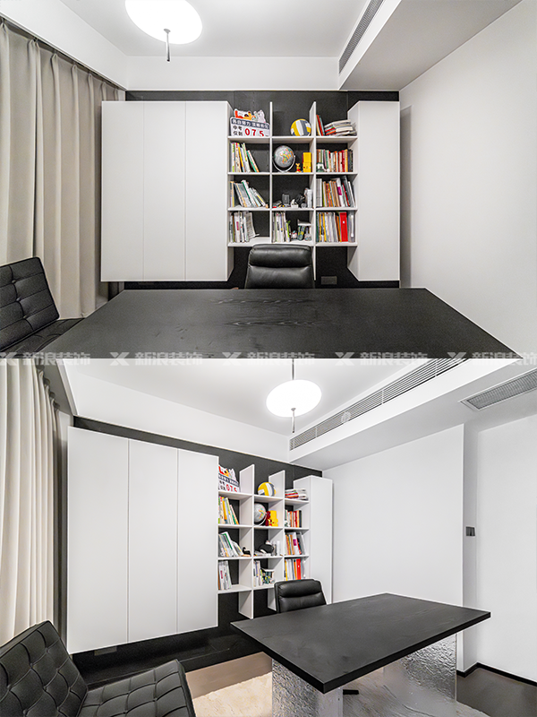 書房采用懸挑設計,搭配亞克力桌腳大板桌,視覺輕盈,空間不擁擠。