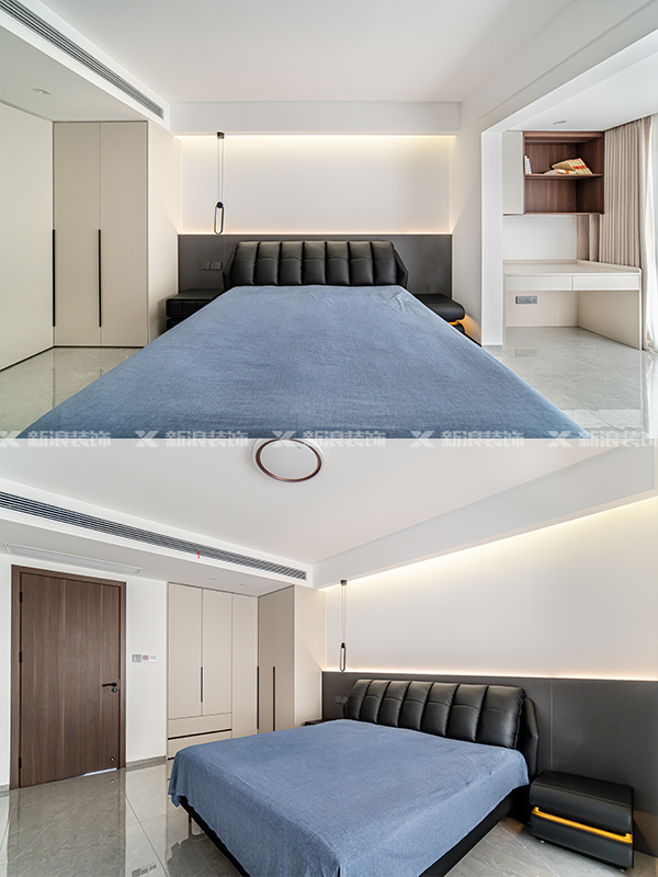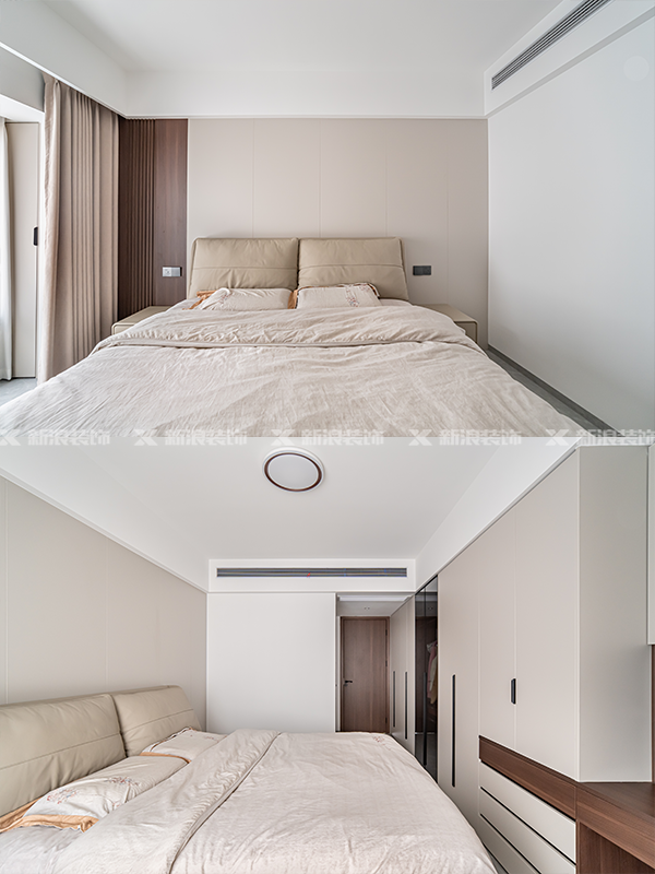 隱形收納:榆木定制柜嵌入墻體,門板一板到頂,極簡無把手設(shè)計(jì)。