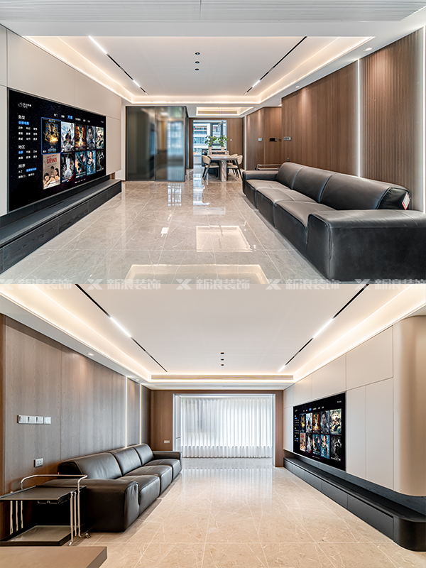 客餐廳咖色木色墻板,搭配大理石島臺,黑色大黑牛沙發,把整體的基調定住