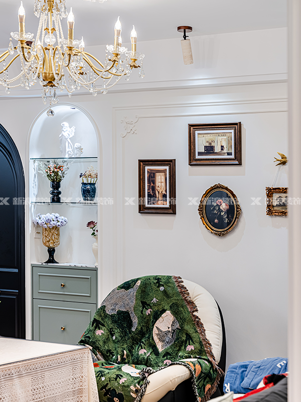 墻面使用法式石膏線搭配淺色乳膠漆,局部采用碎花壁紙和裝飾品搭配。