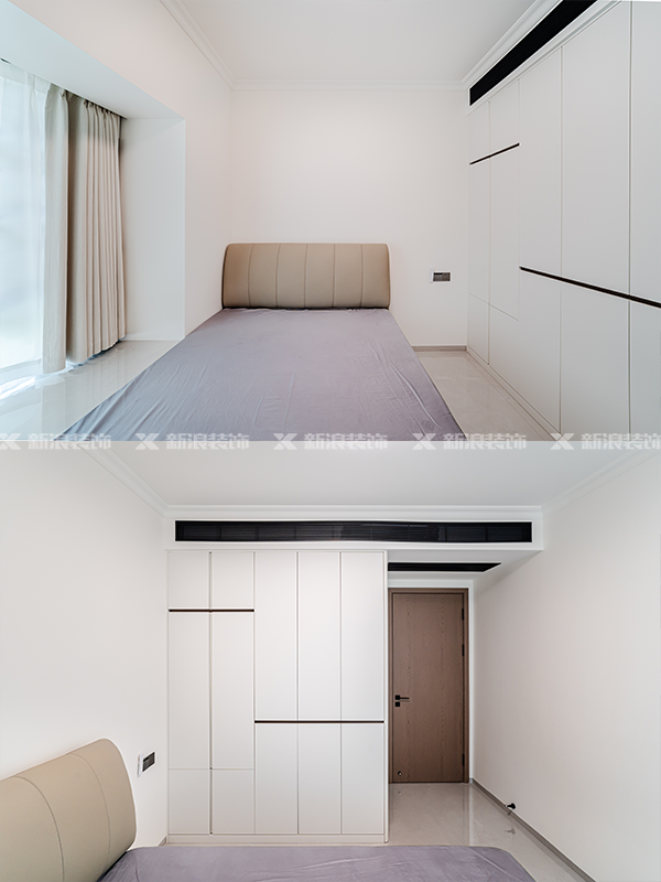·主臥衣柜分段搭配鏤空書桌梳妝臺,,空間利用率超高的。臥室不做復(fù)雜設(shè)計,回歸最原始的休息功能。